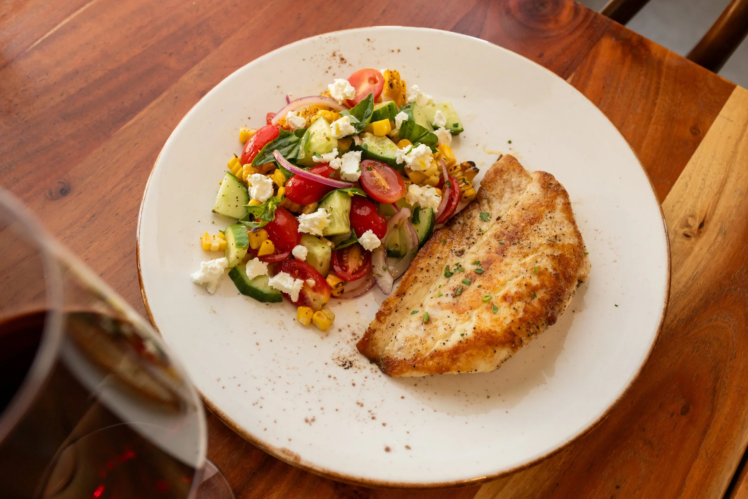 Grilled fillet with a cucumber, tomato, red onion, sweet corn and feta cheese salad with an Italian dressing