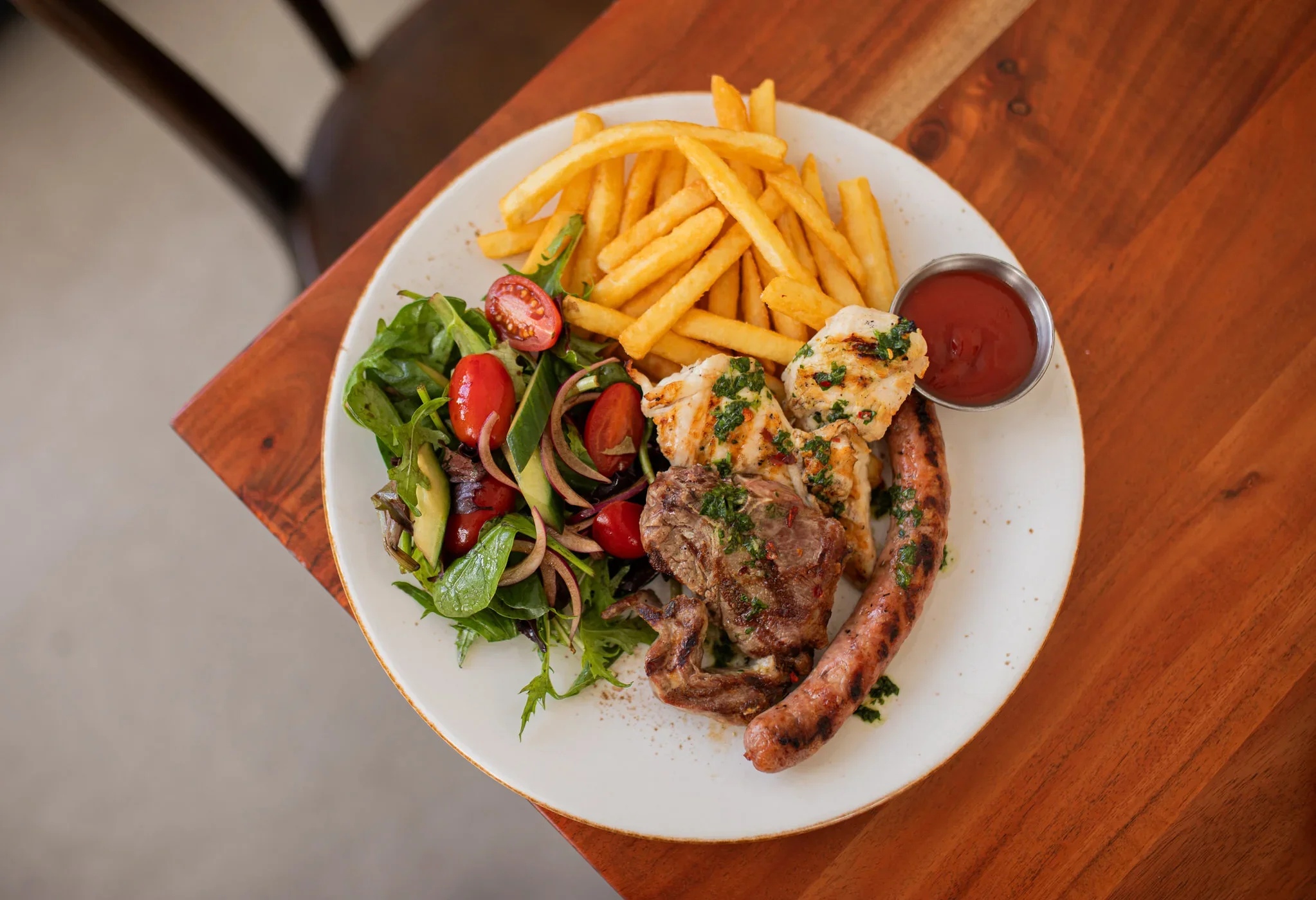 Italian sausage, chicken tenderloins, lamb loin chops, served with garden salad, fried chips and chimichurri sauce