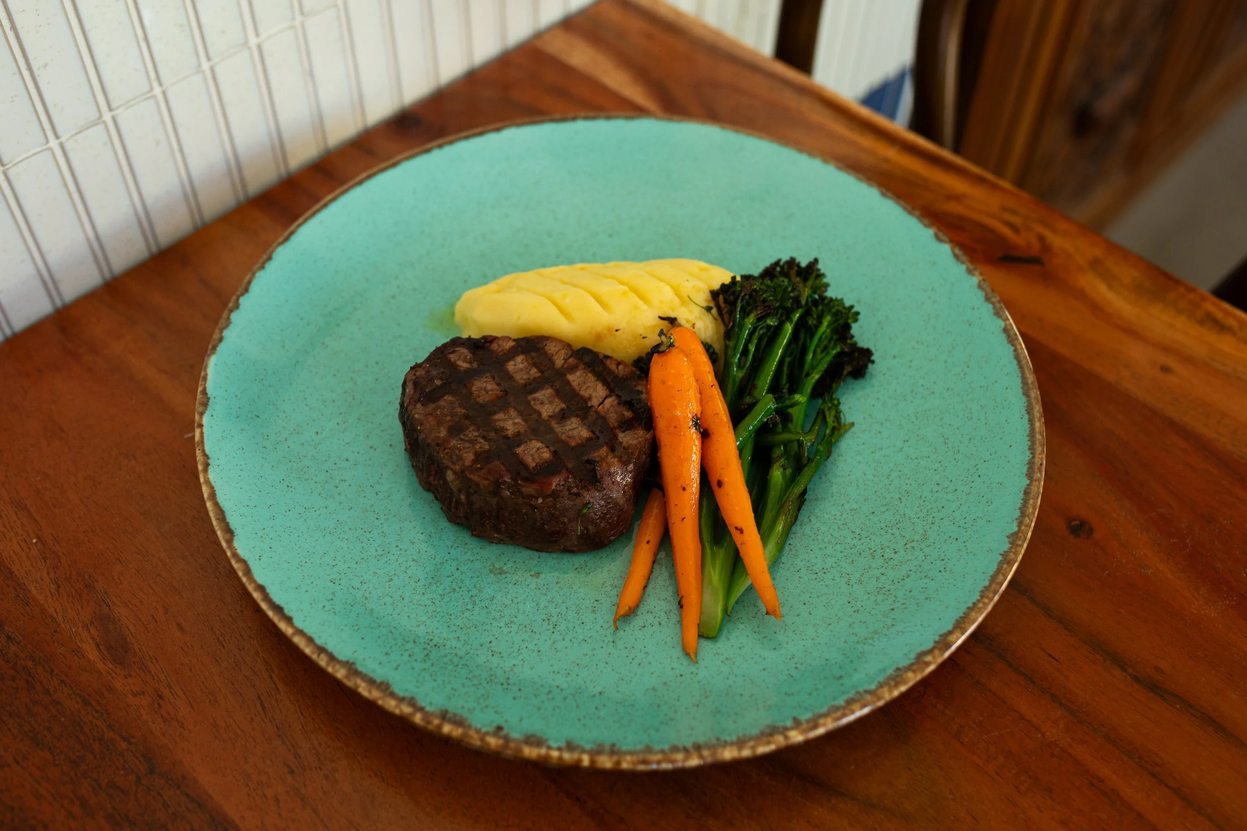 200g Eye fillet, Mashed potato, baby carrots, broccolini, truffle Diane sauce.